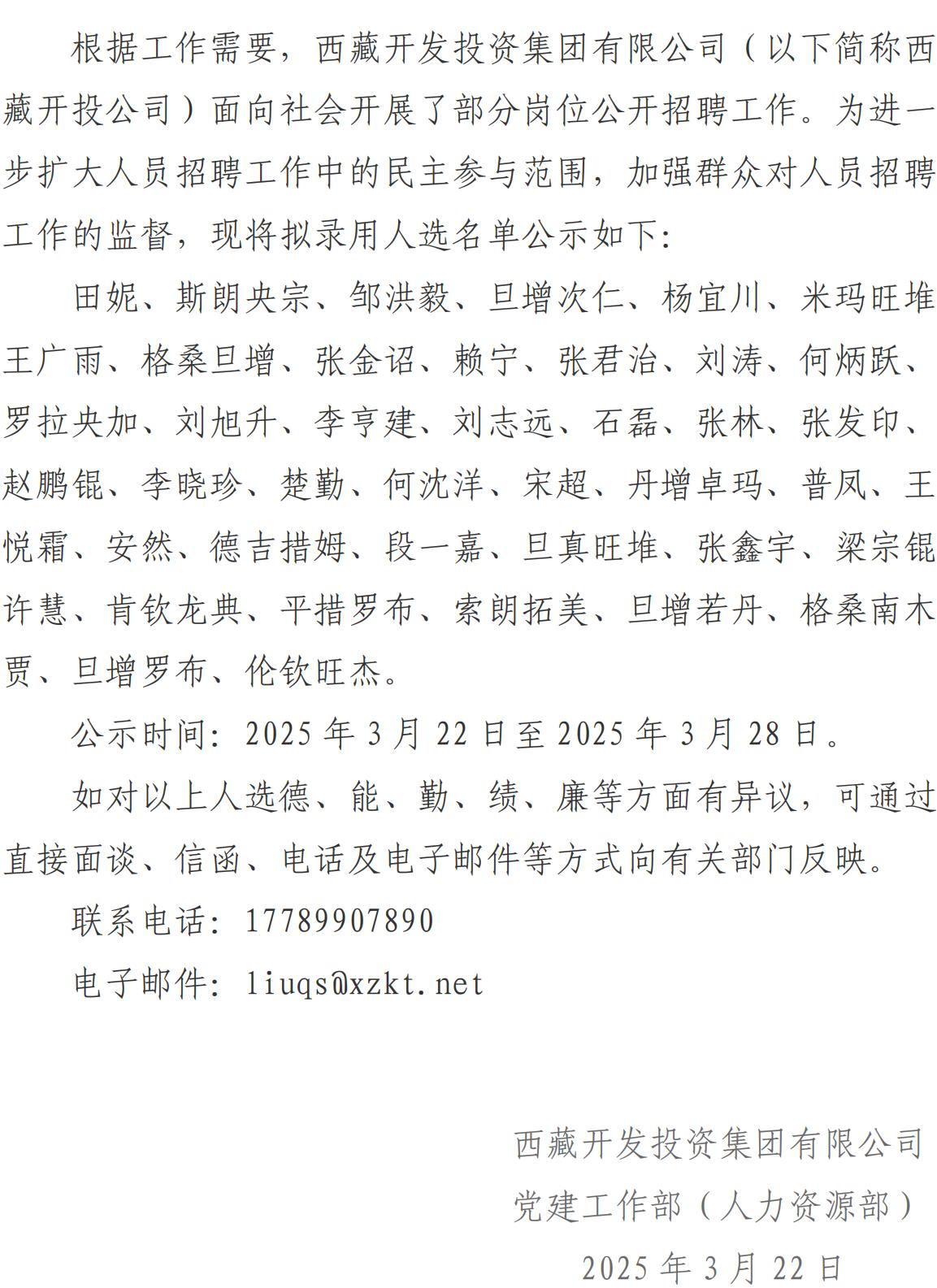 西藏開(kāi)發(fā)投資集團(tuán)有限公司2024年11月社會(huì)招聘擬錄用人員公示