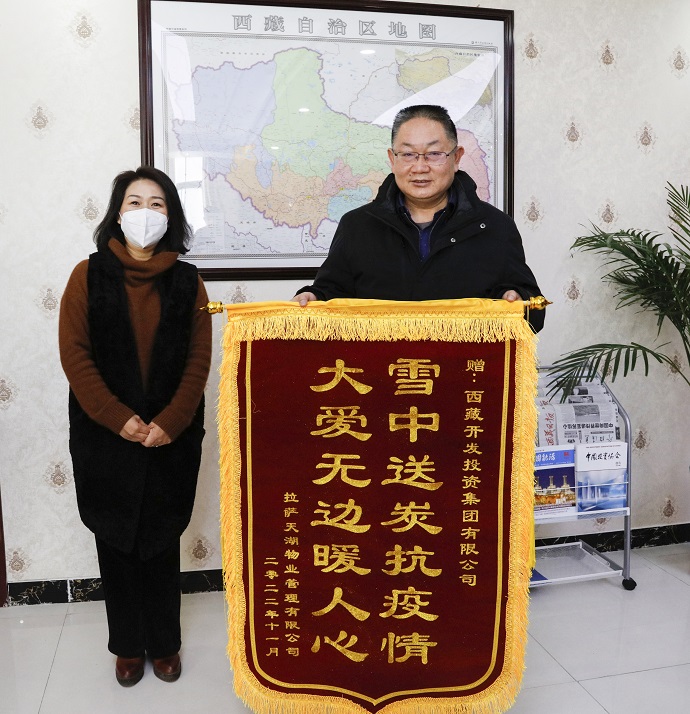 1月10日,拉薩天湖物業(yè)管理有限公司總經(jīng)理賈玉玲將一面印有“雪中送炭抗疫情,大愛(ài)無(wú)邊暖人心”的錦旗送到集團(tuán)公司,感謝西藏開投集團(tuán)慷慨捐贈(zèng)抗疫物資,幫助解決天湖物業(yè)疫情防控實(shí)際困難和迫切需要,展現(xiàn)了國(guó)有企業(yè)的責(zé)任和擔(dān)當(dāng)。