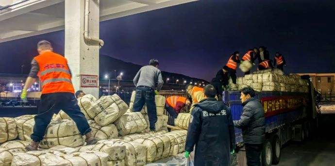 1月9日20點,拉薩貢嘎國際機場貨站內(nèi)燈火通明,西藏開投集團20多名工作人員正在緊急卸裝救援物資,一件件棉衣棉被下了飛機立即裝車,準備運往災(zāi)區(qū)。