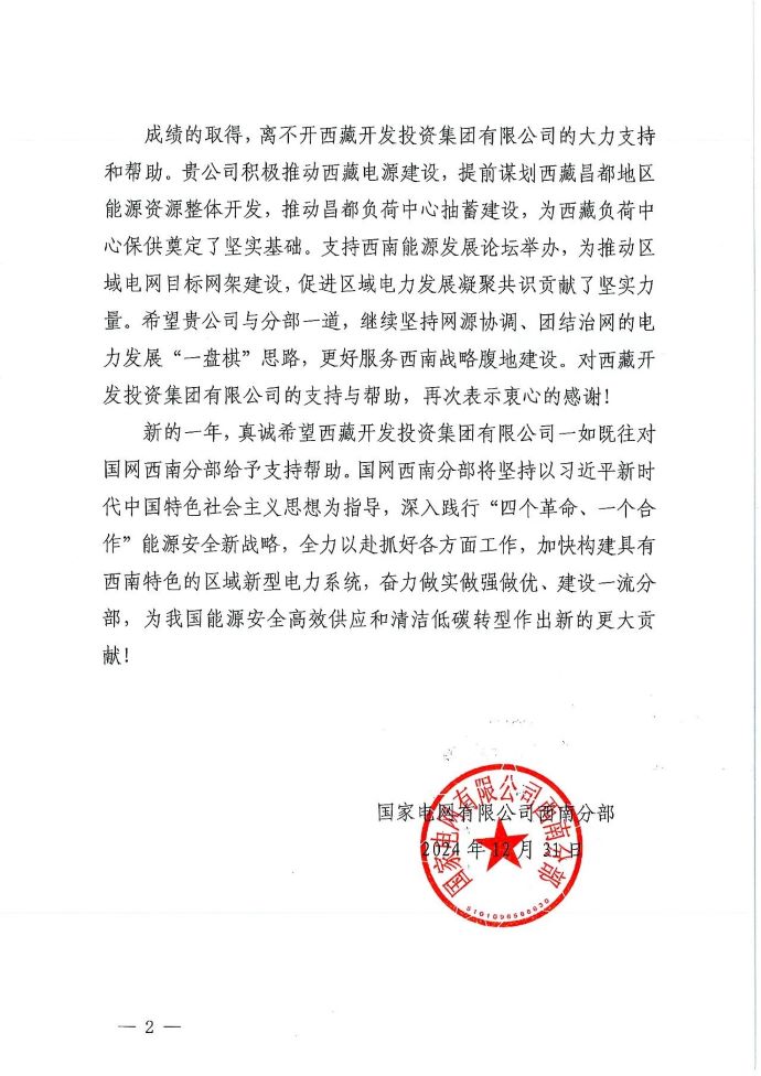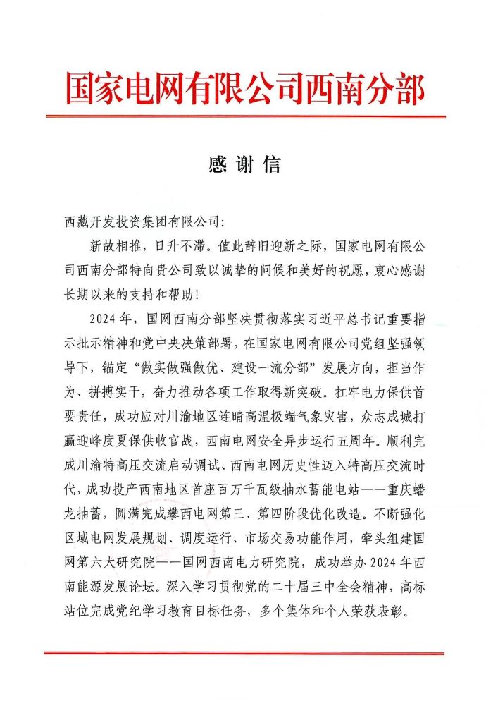 新年伊始,西藏開投集團收到來自國網電力有限公司西南分部的一封感謝信,對集團積極推動西藏電源建設,提前謀劃西藏昌都地區(qū)能源資源整體開發(fā),推動昌都負荷中心抽蓄建設,以及支持西南能源發(fā)展論壇舉辦,推動區(qū)域電網目標網架建設,促進區(qū)域電力發(fā)展凝聚共識作出的貢獻表示感謝。