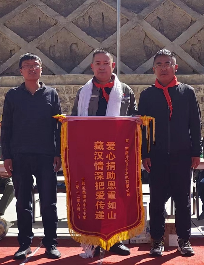果多水電公司代表張二林同志作了題為“祖國的未來,民族的希望”的講話,并代表果多水電公司給學(xué)校捐贈了學(xué)習(xí)用品,足球、排球、羽毛球等,勉勵孩子們要樹立遠(yuǎn)大理想,努力學(xué)習(xí),健康成長,以優(yōu)異的成績回報(bào)社會、回報(bào)祖國。柴維鄉(xiāng)小學(xué)贈送了“愛心捐助恩重如山,藏漢情深把愛傳遞”的錦旗,感謝果多水電公司對學(xué)校的關(guān)心支持幫助。