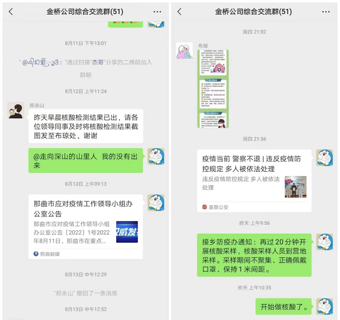 付少龍通過微信工作群及時將區(qū)、市、縣、公司疫情防控工作決策部署、防控政策措施、疫情防控違法違規(guī)行為等傳達(dá)給全體員工,引導(dǎo)員工做好自身防護(hù)的同時,做到不信謠、不傳謠、不恐慌、不松懈。