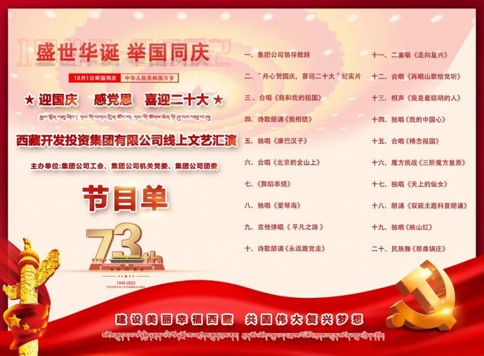 為迎接黨的二十大勝利召開(kāi),以良好的精神風(fēng)貌向祖國(guó)73周年華誕獻(xiàn)禮,9月30日,西藏開(kāi)投集團(tuán)舉辦“迎國(guó)慶、感黨恩、喜迎二十大”主題線上職工文藝晚會(huì)。集團(tuán)公司黨委書(shū)記、董事長(zhǎng)祁騰武出席活動(dòng)并致辭。集團(tuán)公司領(lǐng)導(dǎo)班子成員劉剛、陳焱罡、羅布次仁、溫勇、鄧強(qiáng)、尼瑪出席活動(dòng)。