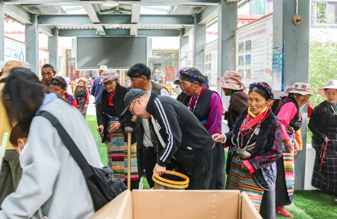 (西藏開投新能源公司員工與現(xiàn)場受慰問老人合影。蔣雨伶 攝)