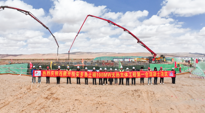 4月28日,西藏開投安多土碩100兆瓦光熱+800兆瓦光伏一體化項目迎來關(guān)鍵節(jié)點——聚光集熱塔基礎(chǔ)第一倉混凝土順利澆筑完成。為后續(xù)吸熱塔主體澆筑及定日鏡安裝奠定了堅實基礎(chǔ)。