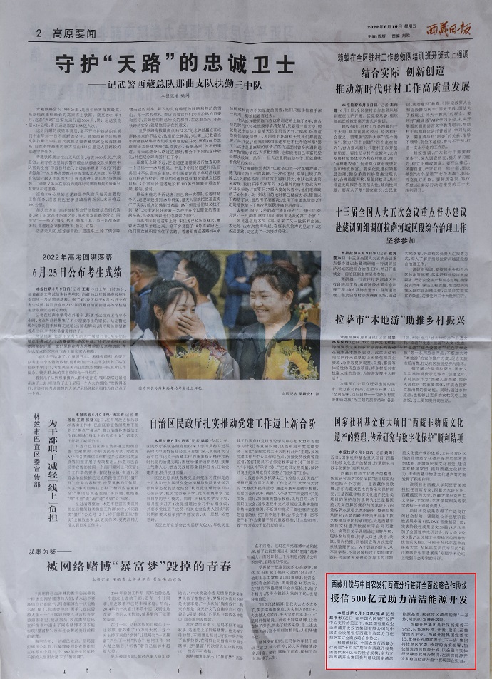 ?。ň幷甙矗?月10日,《人民日報》客戶端西藏頻道報道了《授信500億元 助力西藏清潔能源開發(fā)》?!段鞑厝請蟆?022年6月10日在第2版“高原要聞”欄目刊登文章,報道《授信500億元|西藏開投集團與中國農發(fā)行西藏分行簽訂全面戰(zhàn)略合作協(xié)議》。西藏電視臺2022年6月10日在西藏電視臺影視文化頻道《今晚九點》欄目報道了《授信500億元|西藏開投集團與中國農發(fā)行西藏分行簽訂全面戰(zhàn)略合作協(xié)議》,《珠峰云》平臺同步播放。新華網(wǎng)、經(jīng)濟日報、西藏衛(wèi)視、西藏日報客戶端、網(wǎng)信西藏、今日頭條等媒體均報道了相關新聞。全文如下: