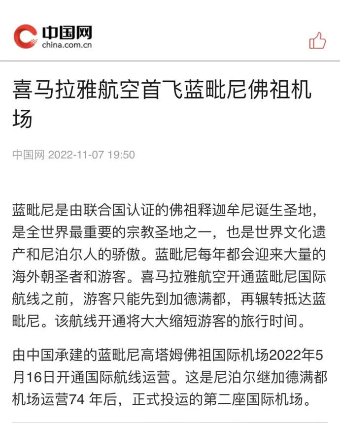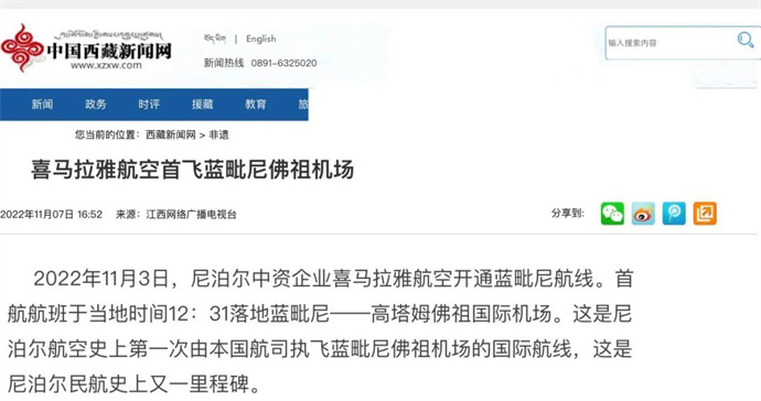?。ň幷甙矗?2022年11月4日至9日,中華網(wǎng)、中國網(wǎng)、中企網(wǎng)、中青網(wǎng)、中國日報網(wǎng)、光明日報、騰訊網(wǎng)、新浪網(wǎng)、搜狐網(wǎng)、今日頭條、中國旅游新聞網(wǎng)、中國西藏新聞網(wǎng)、拉薩新聞網(wǎng)、西藏生活網(wǎng)、西藏視窗、每日經(jīng)濟西藏、西藏途游網(wǎng)等媒體報道了《喜馬拉雅航空首飛藍毗尼佛祖機場》文章。摘要如下: