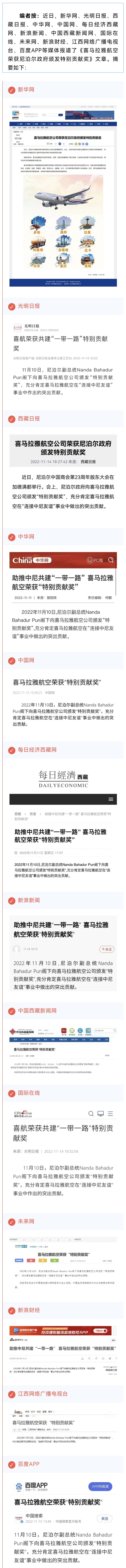 新華網(wǎng)、光明日?qǐng)?bào)、西藏日?qǐng)?bào)、新浪新聞、中國(guó)西藏新聞網(wǎng)等13家媒體報(bào)道喜馬拉雅航空榮獲尼泊爾政府頒發(fā)特別貢獻(xiàn)獎(jiǎng)