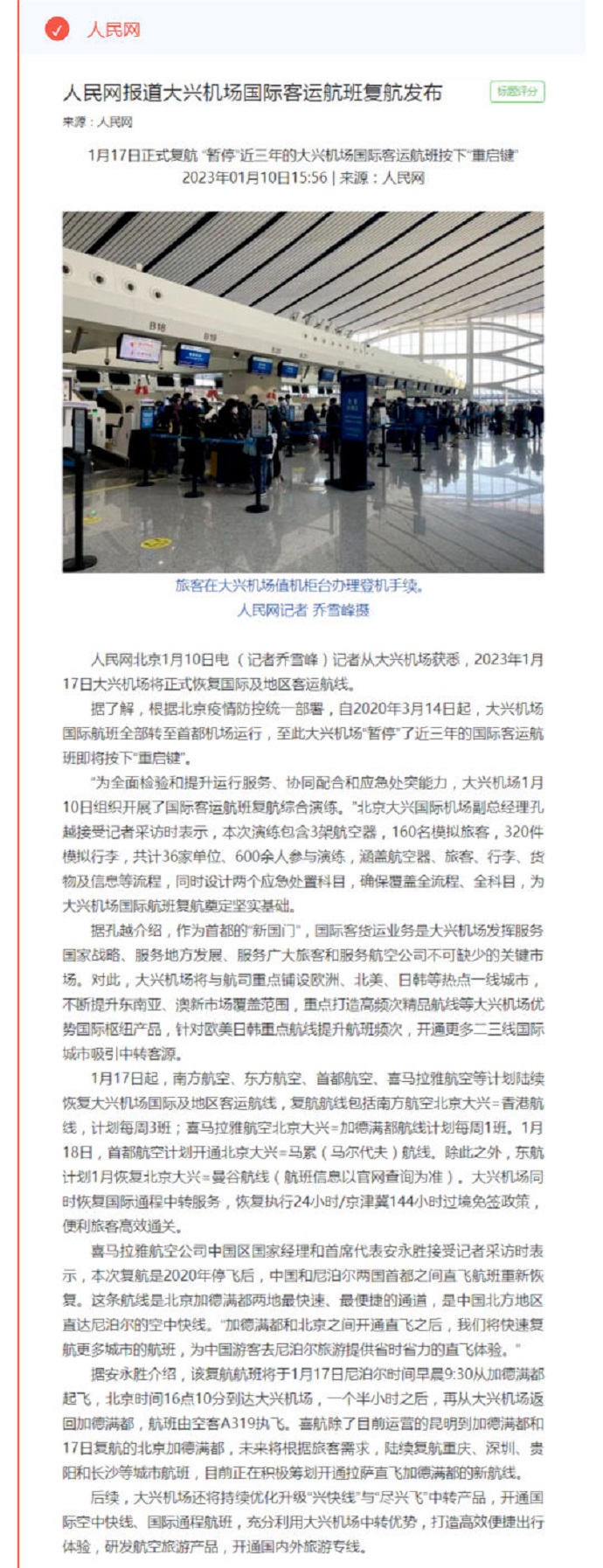 編者按:2023年1月10日,人民網(wǎng)報(bào)道了《1月17日正式復(fù)航 “暫停”近三年的大興機(jī)場(chǎng)國(guó)際客運(yùn)航班按下“重啟鍵”》文章。全文如下: