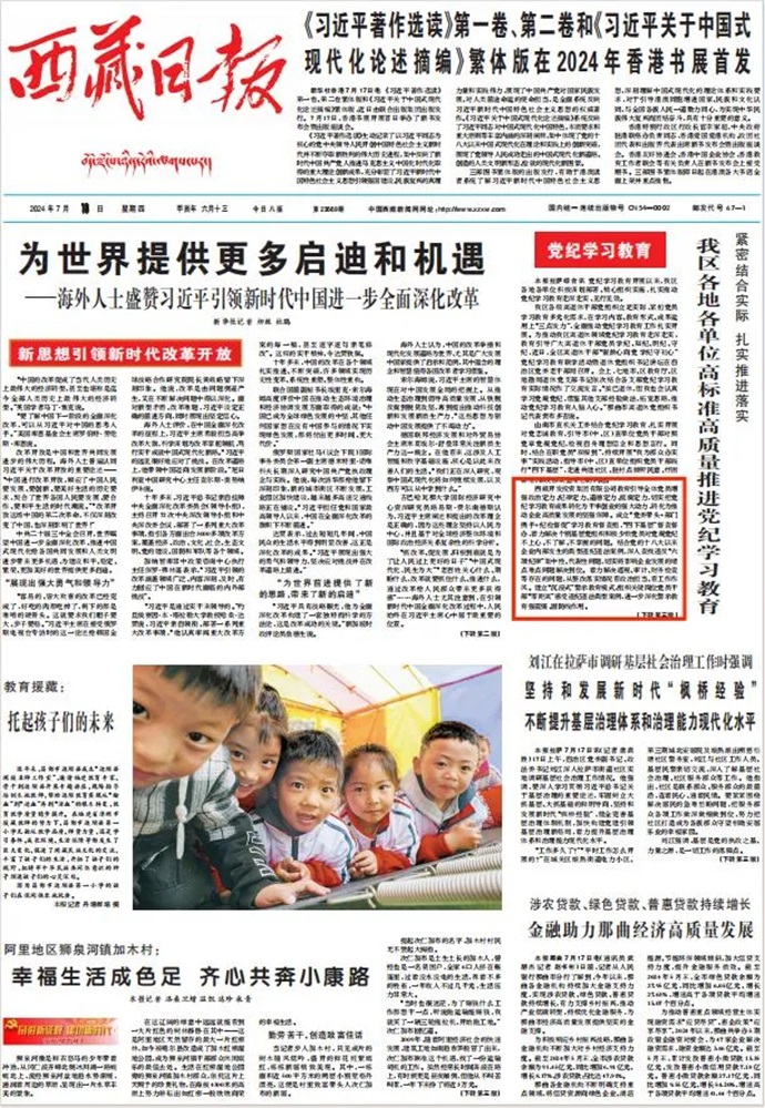 編者按:7月18日,西藏日報(bào)報(bào)道了《緊密結(jié)合實(shí)際 扎實(shí)推進(jìn)落實(shí) 我區(qū)各地各單位高標(biāo)準(zhǔn)高質(zhì)量推進(jìn)黨紀(jì)學(xué)習(xí)教育》文章。摘要如下: