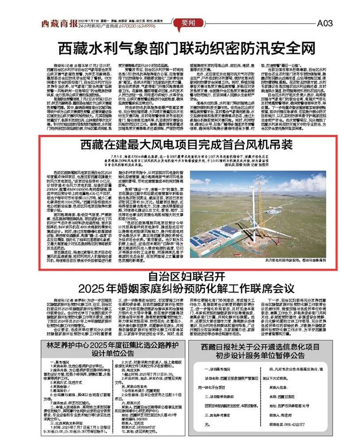媒體報(bào)道丨西藏在建最大風(fēng)電項(xiàng)目完成首臺風(fēng)力發(fā)電機(jī)組吊裝