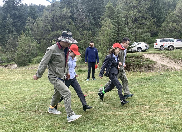 座談結束后,全體黨員面向黨旗莊嚴宣誓,重溫入黨誓詞,激勵永葆入黨初心。最后,兩支部開展了以“重溫紅色”為主題的戶外團建活動,通過重走長征路、黨建知識問答、紅色詞匯你比我猜、兩人三足等活動進一步增進支部交流互動?;顒蝇F場,參賽隊員充分發(fā)揚團隊精神,積極參與,精誠合作,加油聲、吶喊聲、歡呼聲此起彼伏。