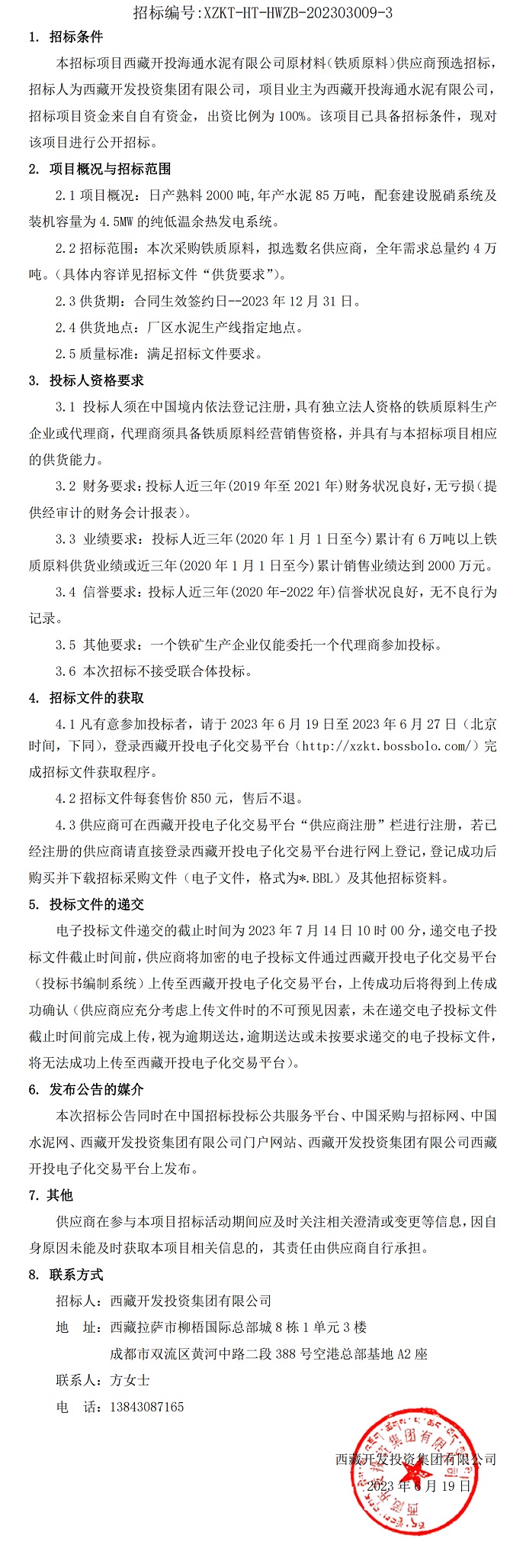 西藏開投海通水泥有限公司原材料(鐵質(zhì)原料)供應商預選招標公告
