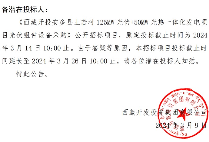 一體化發(fā)電項目光伏組件設(shè)備采購》投標截止時間的公告