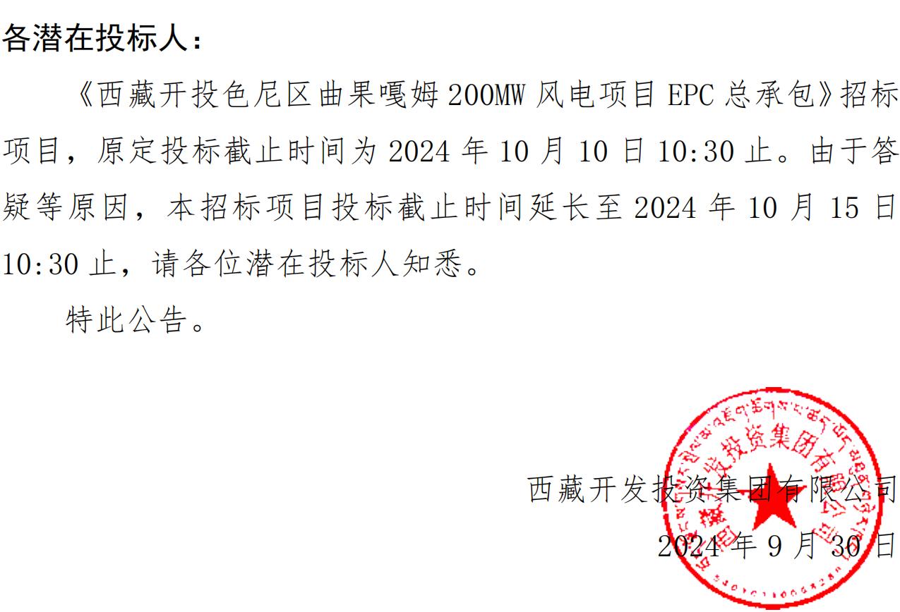 關于延長《西藏開投色尼區(qū)曲果嘎姆200MW風電項目EPC總承包》投標截止時間的公告
