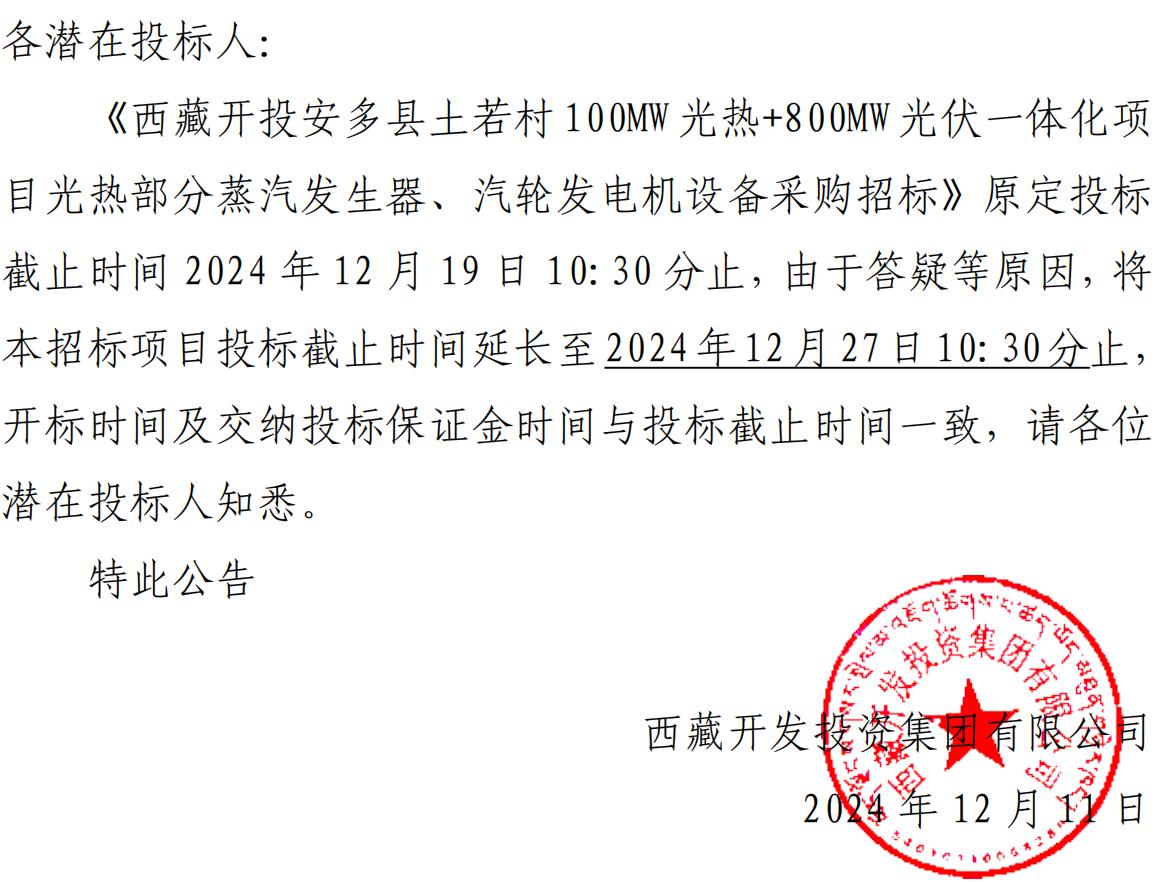 關(guān)于延長《西藏開投安多縣土碩 100MW 光熱+800MW 光伏一 體化項目光熱部分蒸汽發(fā)生器、汽輪發(fā)電機設(shè)備采購招標》投 標截止時間的公告