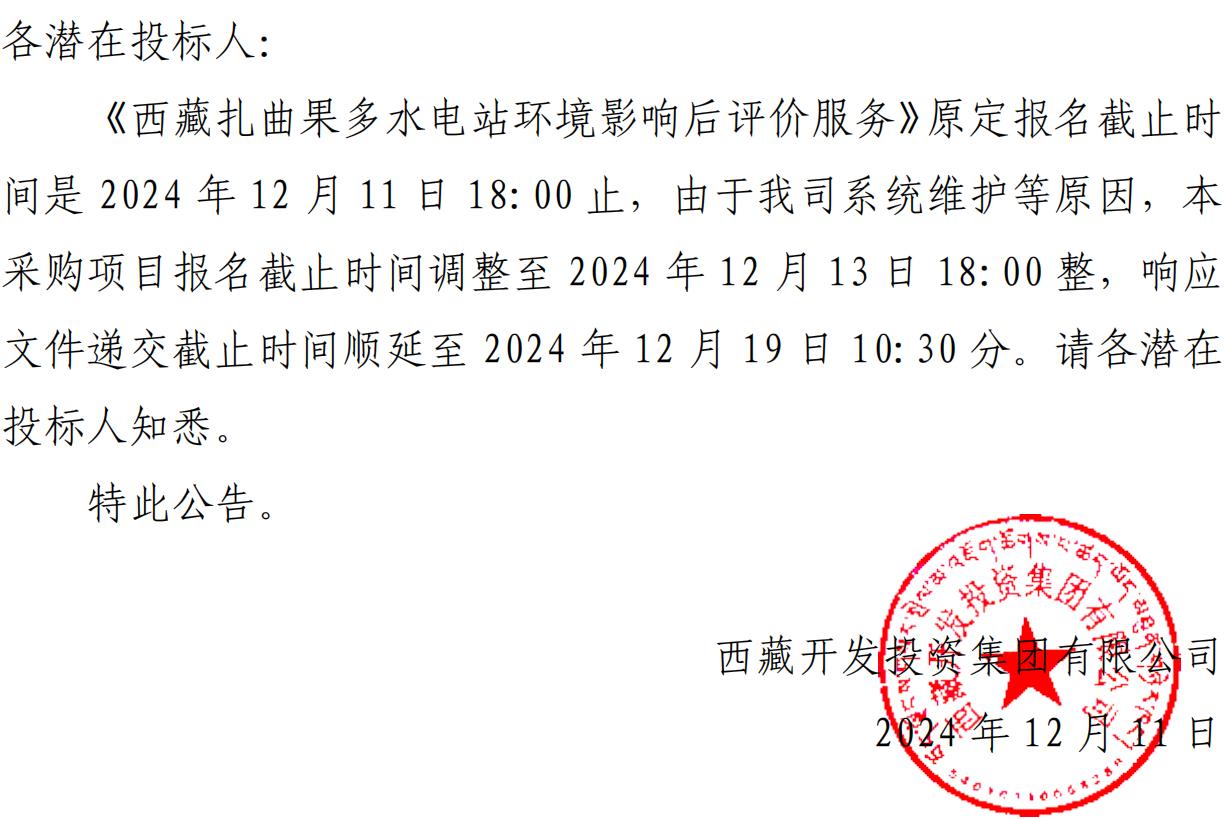 關(guān)于延長《西藏扎曲果多水電站環(huán)境影響后評價服務(wù)》詢價報名截止時間的公告