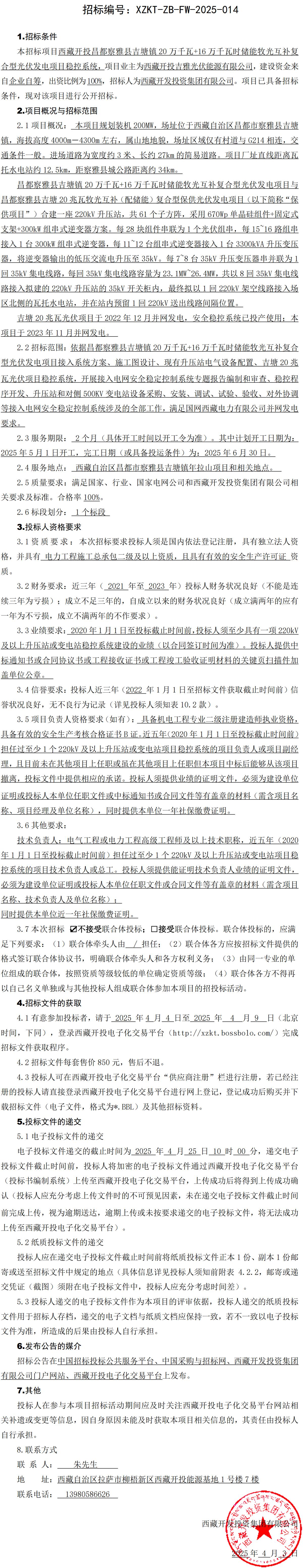 西藏開(kāi)投昌都察雅縣吉塘鎮(zhèn)20萬(wàn)千瓦+16萬(wàn)千瓦時(shí)儲(chǔ)能牧光互補(bǔ)復(fù)合型光伏發(fā)電項(xiàng)目穩(wěn)控系統(tǒng)招標(biāo)公告