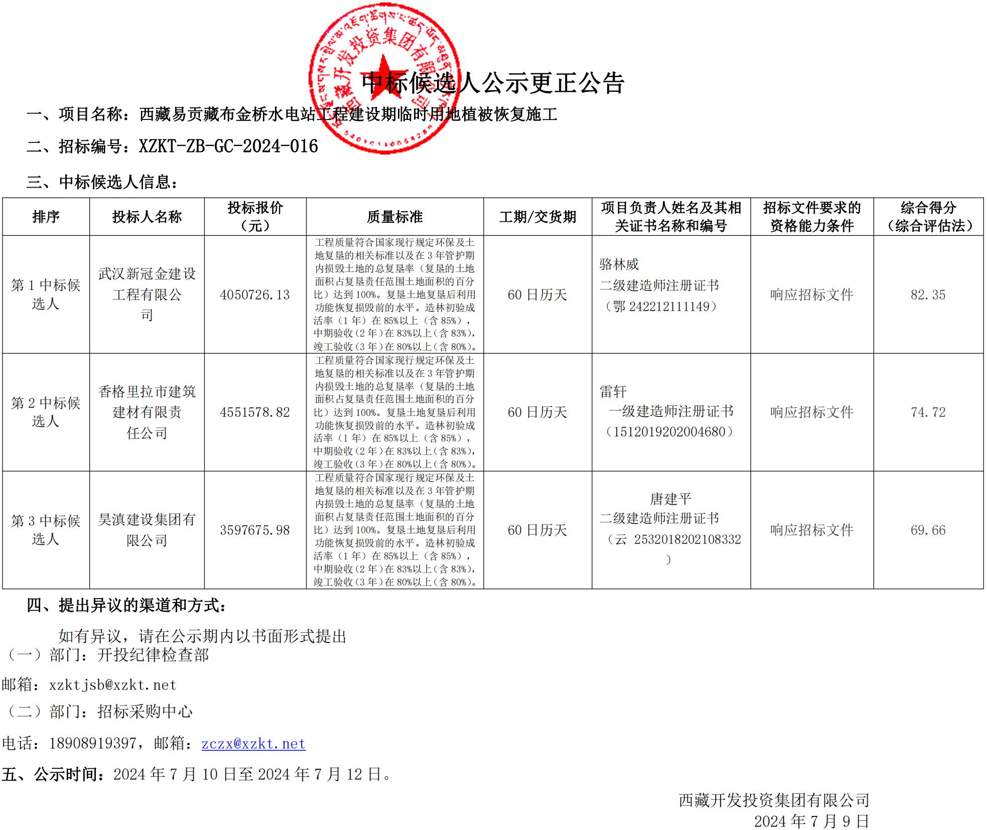中標候選人公示更正公告
